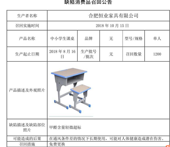 10月17日,记者从省质监局获悉,合肥恒业家具有限公司决定自2018年10月15日起召回2018年8月16日生产的中小学生课桌,涉及产品数量共1200件。